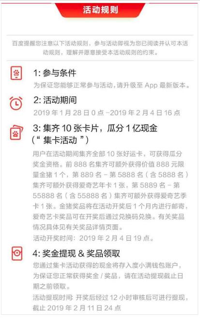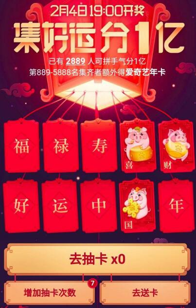 3、成功集齊卡片的人不僅可以瓜分一個億,還有額外禮品相送!前888名集齊可額外贈送限量金豬一個,第889名-第5888名集齊可額外贈送愛奇藝年卡一張,第5889名-第55888名集齊可額外贈送愛奇藝季卡一張。目前僅有2889人集齊了這十張卡,你還在等什么,趕快行動起來吧!