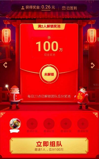 1、點擊立即分錢即可進(jìn)入分錢頁面,每日簽到可以獲得獎金。如果你想獲得更多錢的話,是需要邀請好友解鎖獎池的,最少可以邀請一名好友便可組隊。