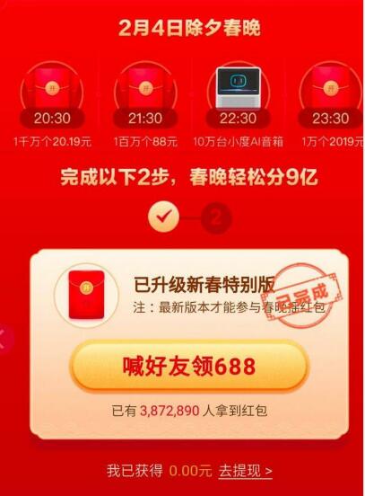 第三部分是春晚當(dāng)天分9億(活動時間為1月28日-2月4日):