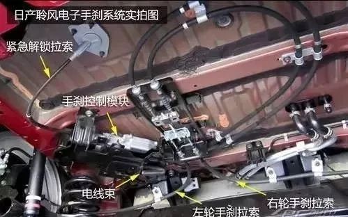 上圖是日產(chǎn)聆風(fēng)的拉索式電子手剎系統(tǒng)實(shí)拍圖。整個(gè)電子手剎系統(tǒng)與傳統(tǒng)拉索式手剎差別不大,僅僅是把原來用于平衡左右側(cè)駐車制動(dòng)力的手剎拉索平衡器換成是電子手剎拉索控制模塊而已。如圖所示,電子手剎拉索的執(zhí)行結(jié)構(gòu)相當(dāng)緊湊,易于在車上加裝。
