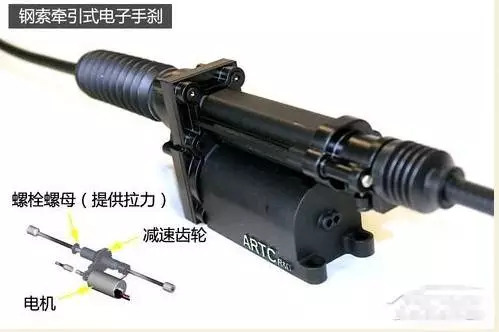 鋼索牽引式電子手剎的制動(dòng)執(zhí)行機(jī)構(gòu)與傳統(tǒng)手剎無異,同為制動(dòng)蹄式,只是把手動(dòng)的拉索改為電動(dòng)形式。正是因?yàn)殇撍鳡恳诫娮邮謩x的加裝成本低,因而更利于車型的設(shè)計(jì)變更。