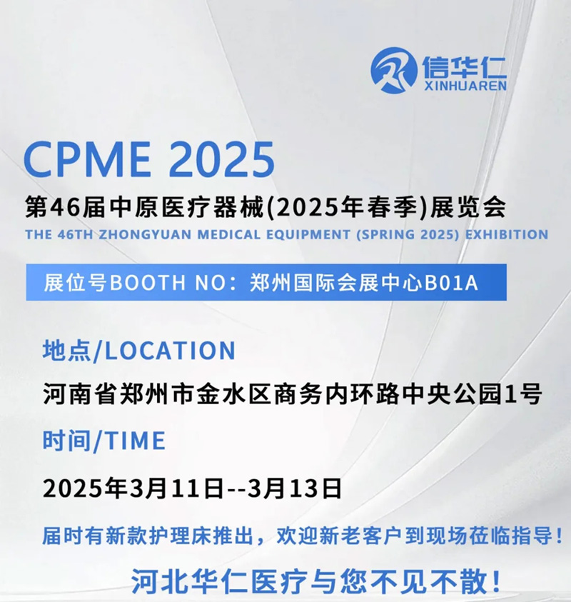 第46屆中原醫(yī)療器械(2025年春季)展覽會 展位號:鄭州國際會展中心B01A 地點:河南省鄭州市金水區(qū)商務內(nèi)環(huán)路中央公園1號 2025年3月11日——3月13日 屆時有新款護理床推出,歡迎新老客戶到現(xiàn)場蒞臨指導! 河北華仁醫(yī)療與您不見不散!