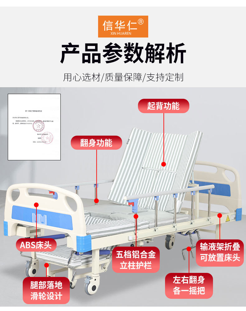標(biāo)準(zhǔn)配置:ABS床頭1副;鋁合金折疊護(hù)欄1副;靜音輪4個(gè);